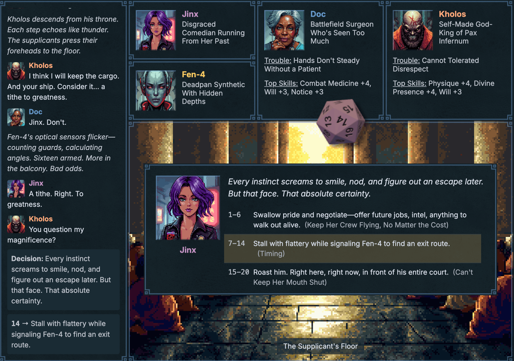 The screenplay is streamed live on Twitch using a custom RPG visualizer and AI pixel art. Whenever a character pauses to make a decision, Twitch can vote on the action they want them to take. When a character is making a skill check, Twitch can gamble channel points on whether they succeed or fail. A random d20 roll decides the outcome and the story follows wherever the live audience can steer it.